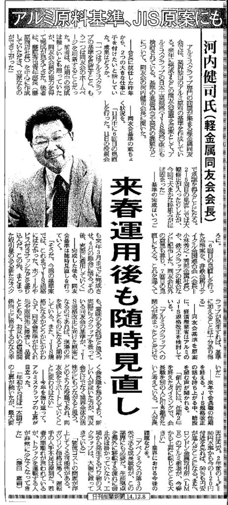14/12/8付、産業新聞にアルミ原料基準に関する記事が掲載されました。